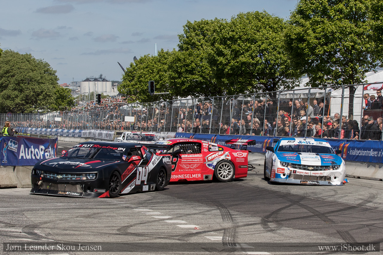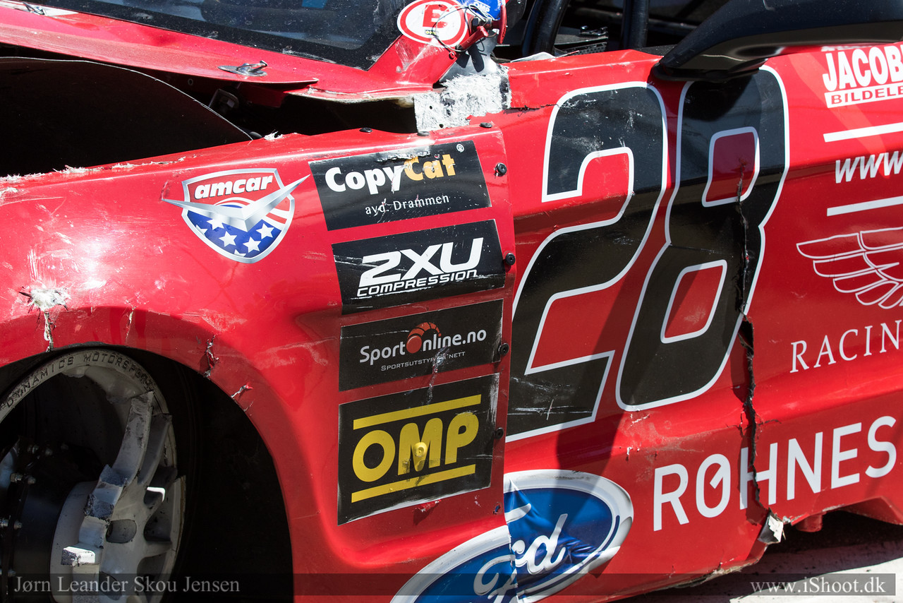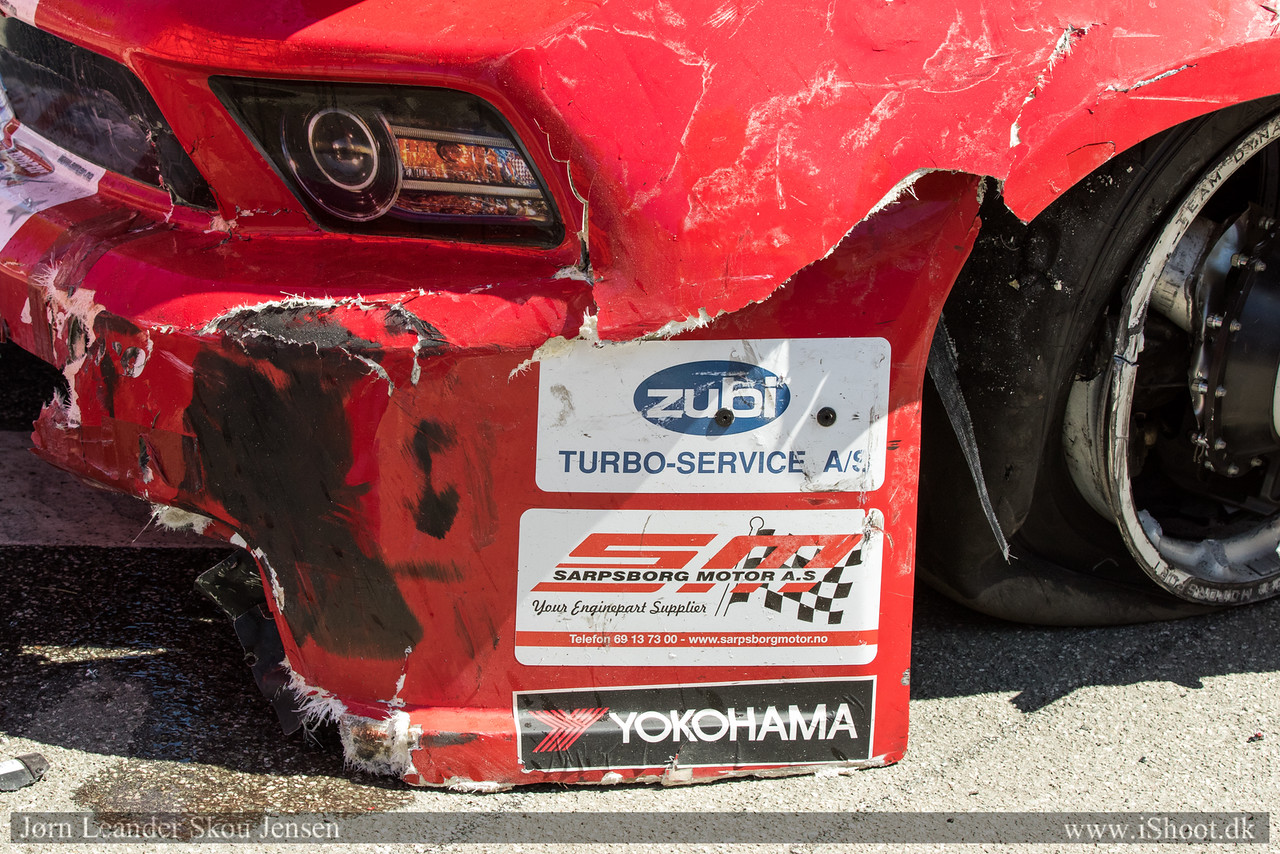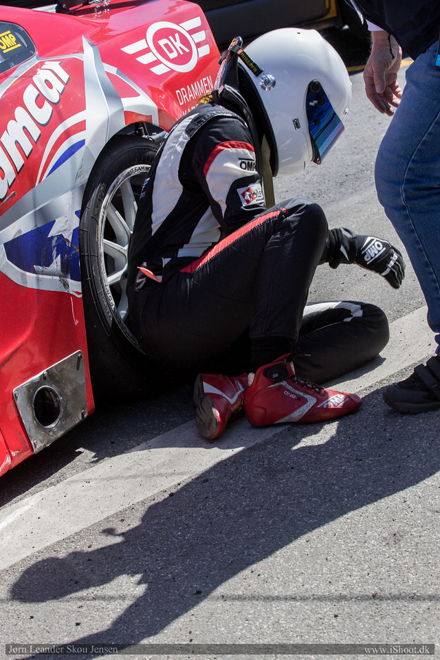 I det første løpet på søndag ble jeg påkjørt bakfra etter 5-6 runder. Jeg fikk teknisk flagg og måtte inn i pit sånn at teamet kunne rive av bak-fangeren. Dette resulterte i at jeg havnet bakerst i feltet, men jeg tok de andre raskt igjen på grunn av safety-car. Når feltet ble sluppet igjen lå jeg bak Bjarne Nordal. Ut på langsiden hadde jeg bedre utgang enn han og mens jeg lå bak kunne jeg tydelig se at han lukket igjen for noe forbikjørings mulighet til høyre som er det mest naturlige stedet å kjøre forbi.
